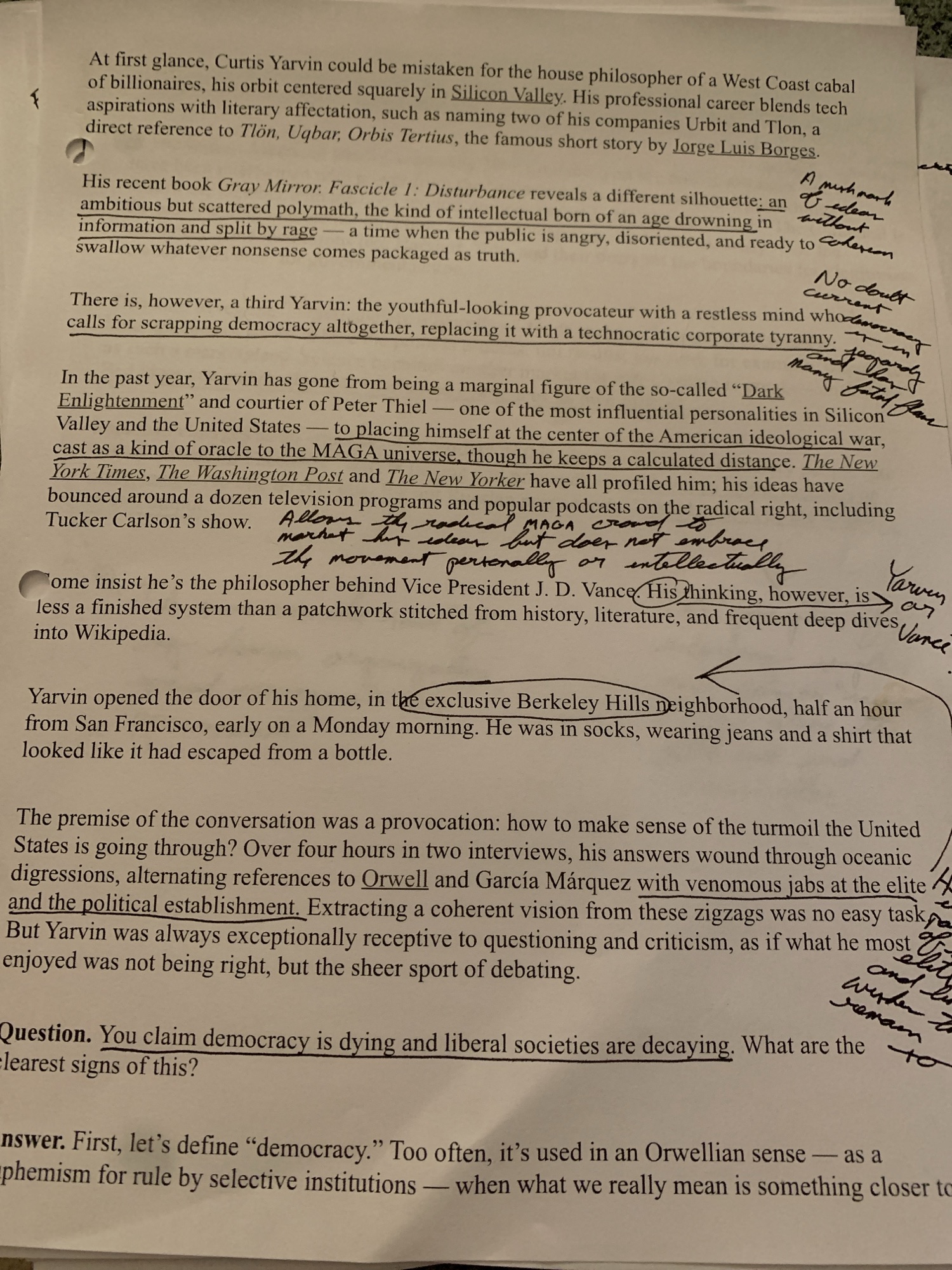 As one of the current darlings of MAGA’s upper echelons, my first impulse when I saw El Pais‘s interview with Curtis Yarvin was to immediately discount it as either a superficial piece of ego stroking or an extended game of cat and mouse where the mouse constantly hid behind thick panels of grandstanding and ad hominem attacks on enemies real or imagined. However, I did not yield to my initial impulse. Perhaps it was because El Pais is a left-leaning newspaper from Spain and I thought it might be freer from the kind of editorial cowardice we’ve seen from what passes for journalism in the United States. After reading the interview (carefully and with many annotations on my printed copy), I came to the conclusion I was not wrong about the newspaper and, to an extent, might be wrong about Curtis Yarvin.